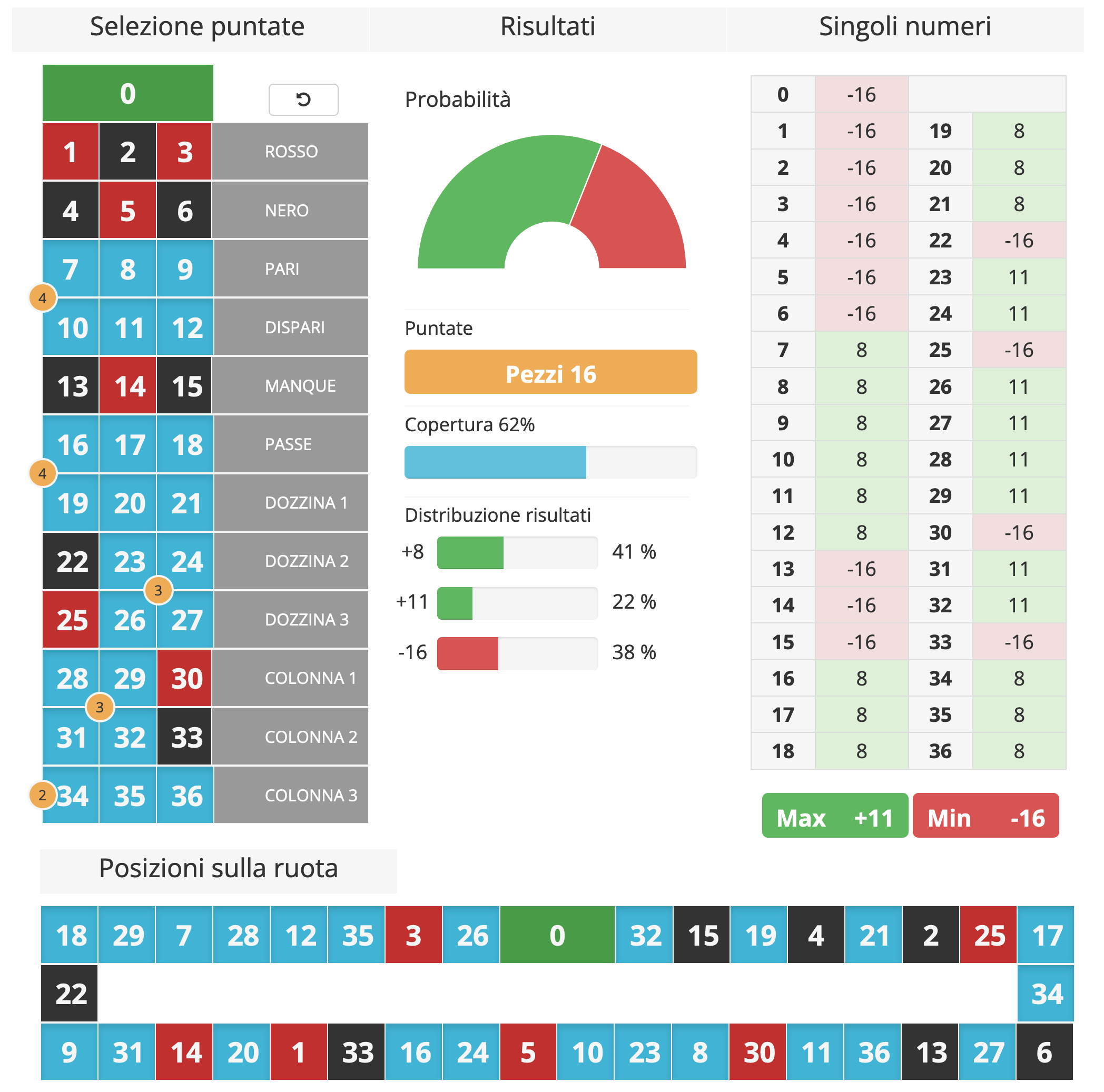 Totale di 23 numeri su 37 ovvero 62% di copertura della ruota (in allegato screenshot bet calculator)